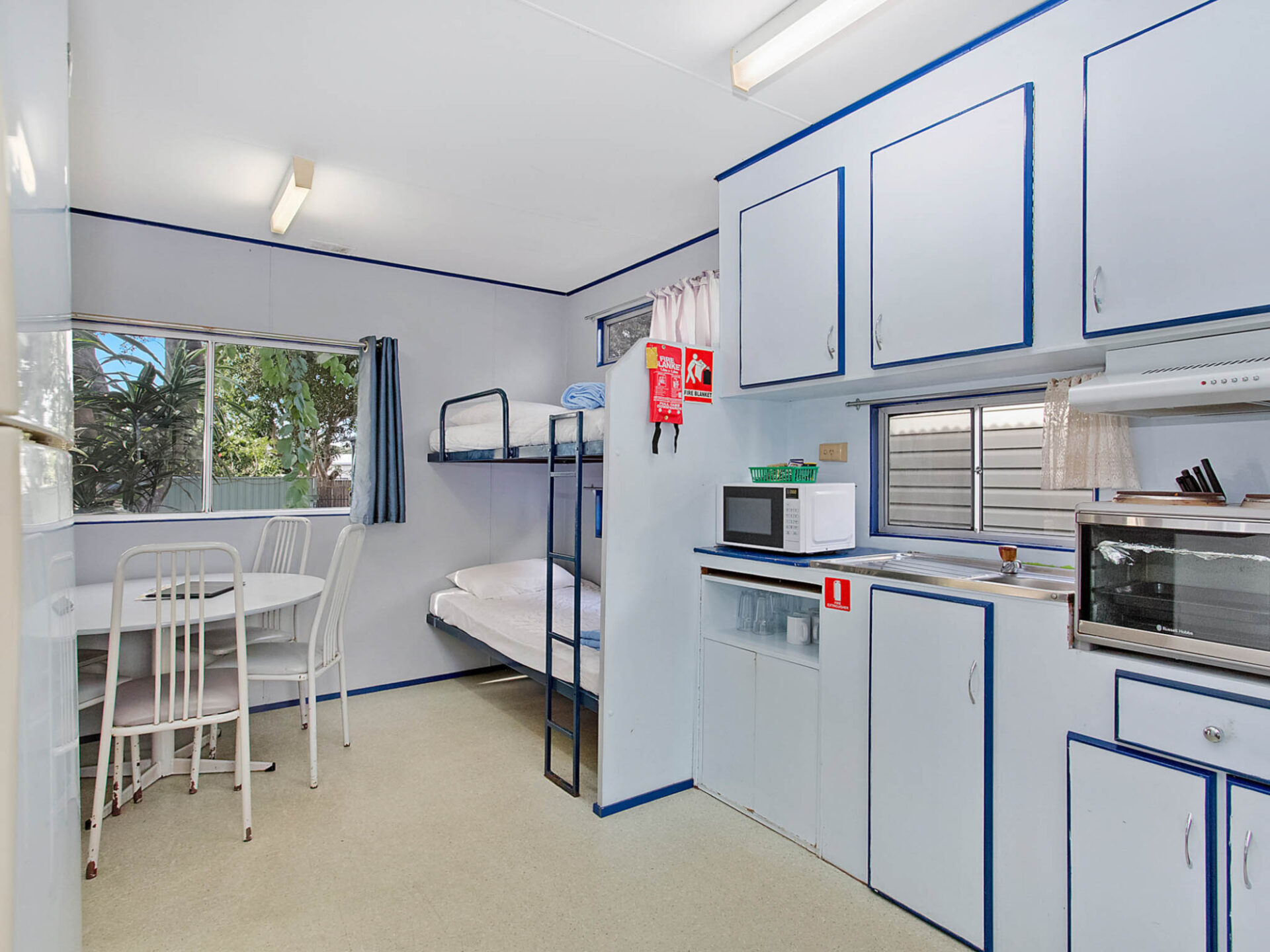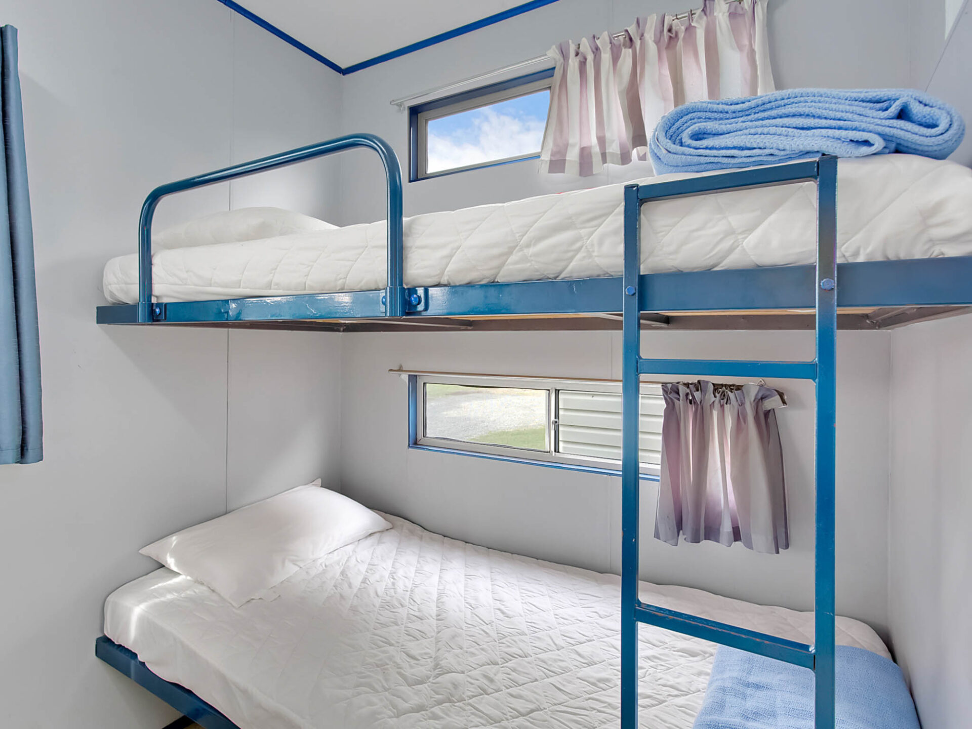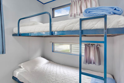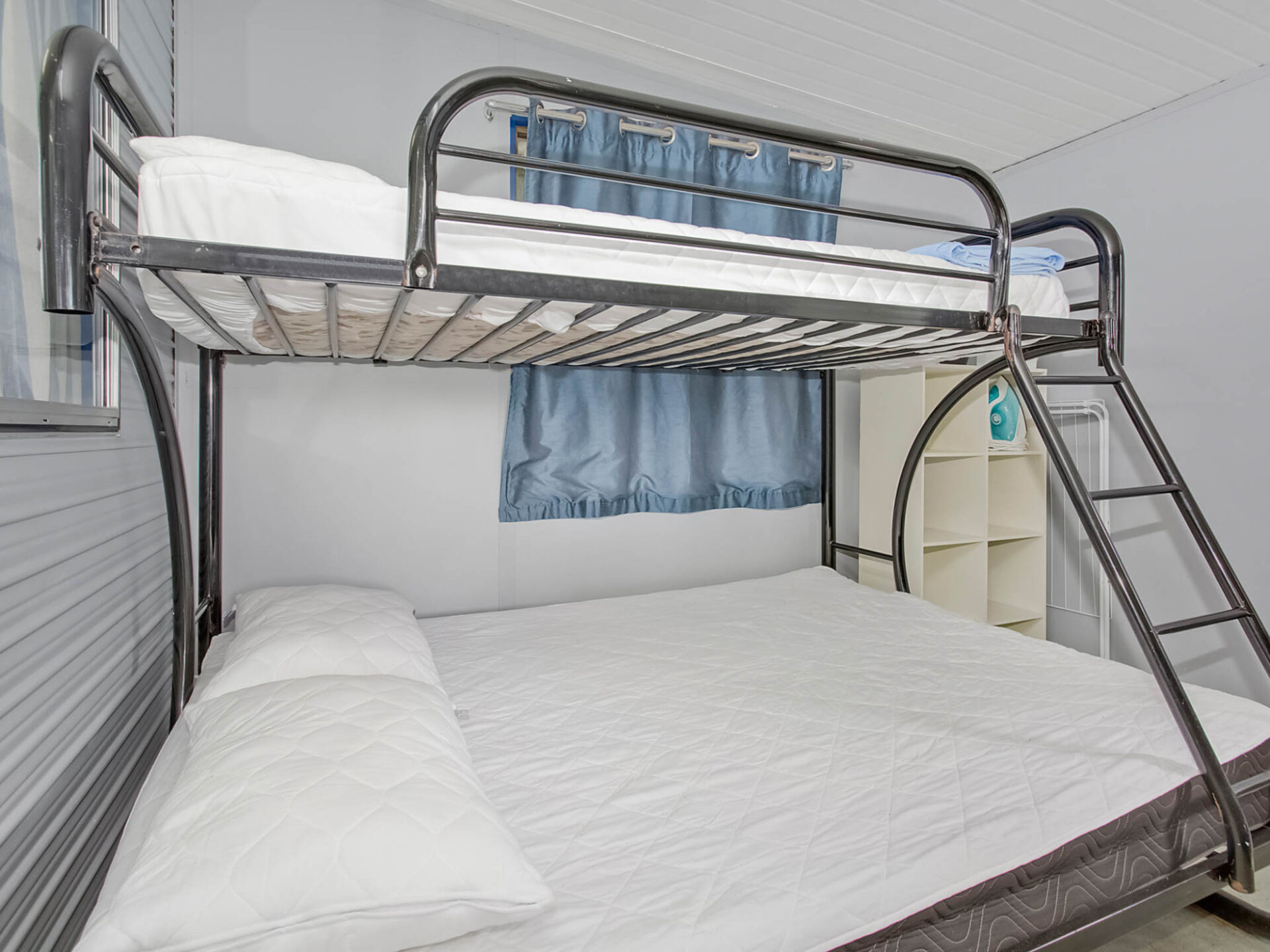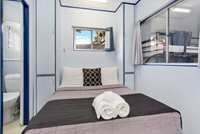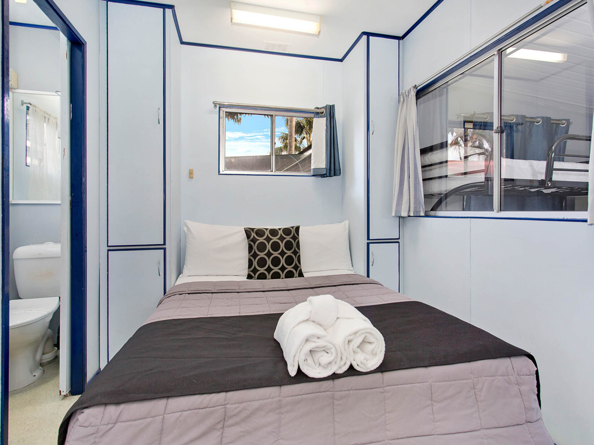 This spacious one-bedroom cabin sleeps up to seven guests and includes a double bed, a set of single bunks, and a tri-bunk. The kitchenette is equipped with a gas oven, microwave, toaster, and bar fridge, making it easy to prepare meals. With air-conditioning, dining area, TV, and a private bathroom with toiletries and towels provided, it’s a practical choice for larger families or groups.