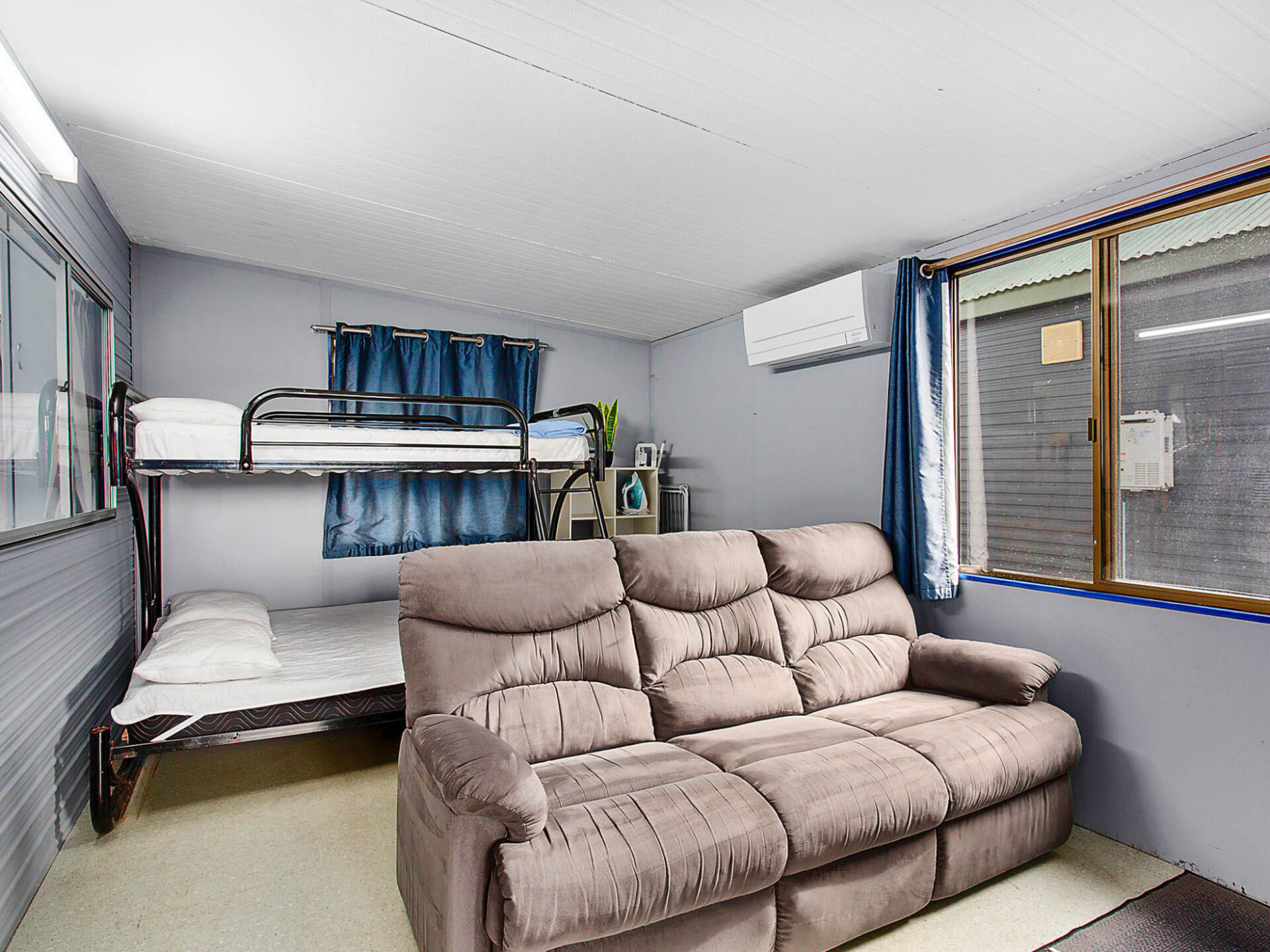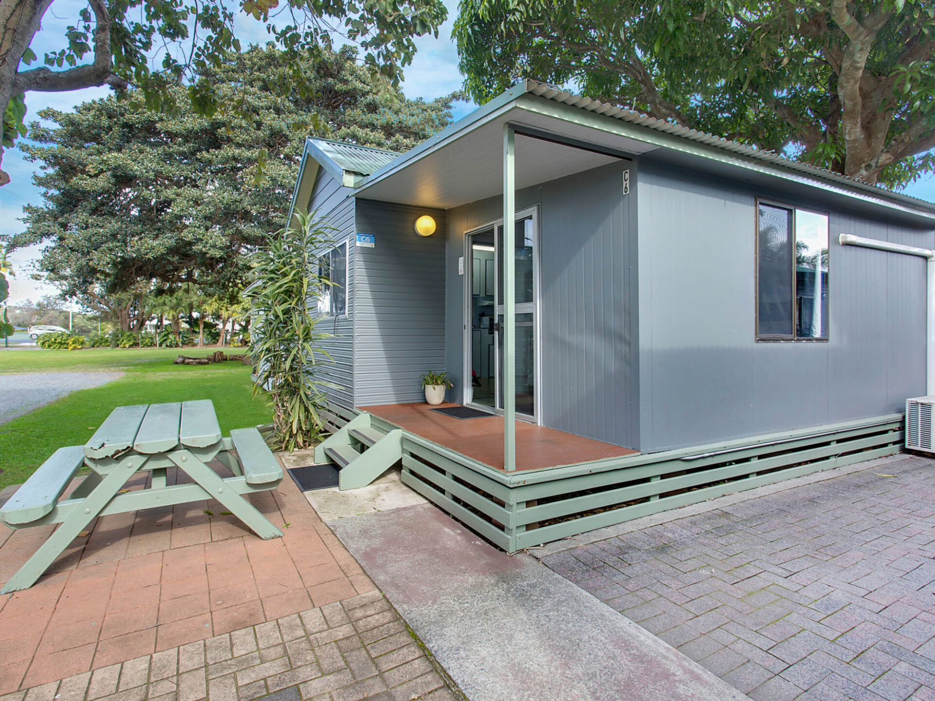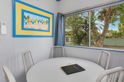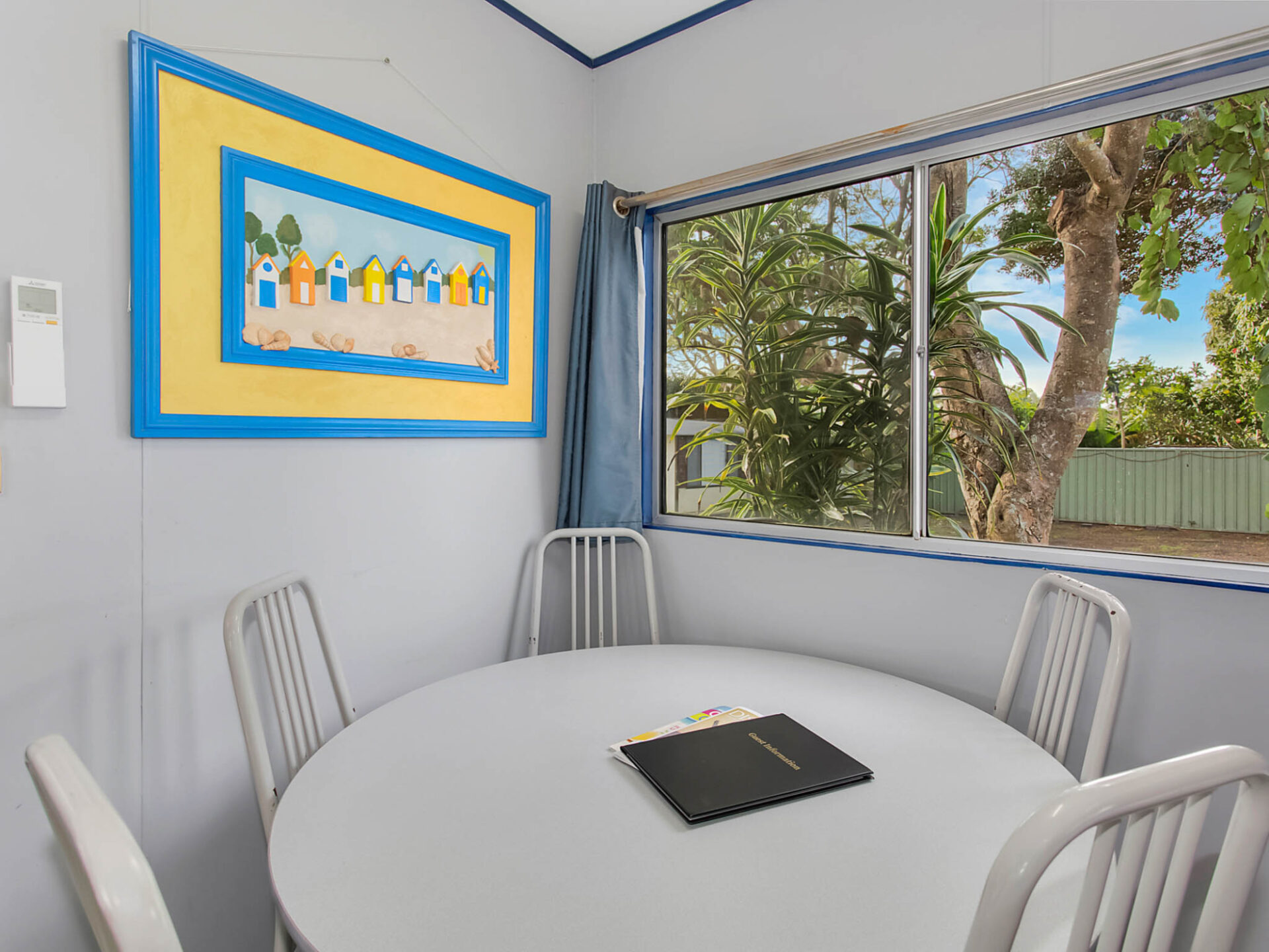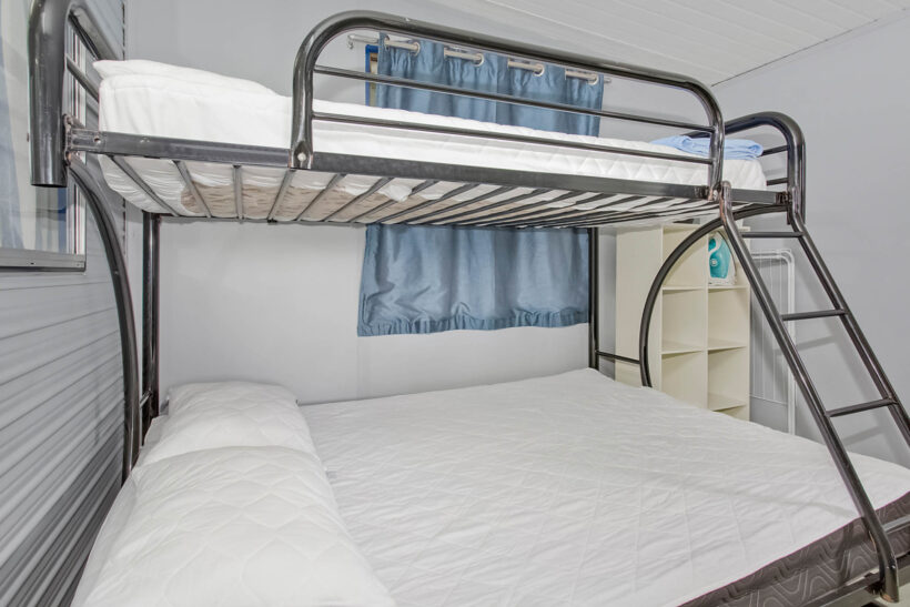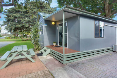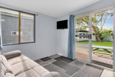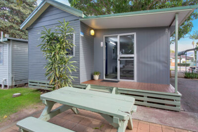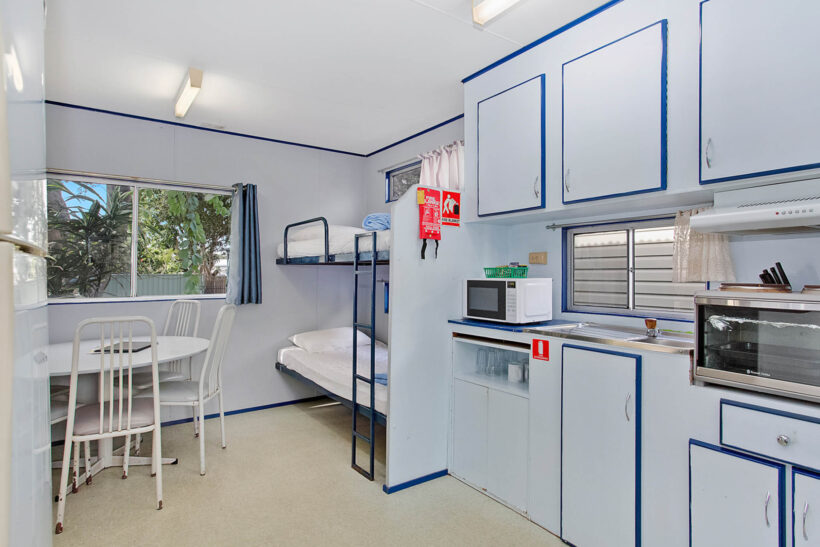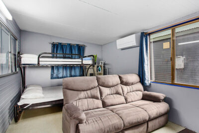 This spacious one-bedroom cabin sleeps up to seven guests and includes a double bed, a set of single bunks, and a tri-bunk. The kitchenette is equipped with a gas oven, microwave, toaster, and bar fridge, making it easy to prepare meals. With air-conditioning, dining area, TV, and a private bathroom with toiletries and towels provided, it’s a practical choice for larger families or groups.