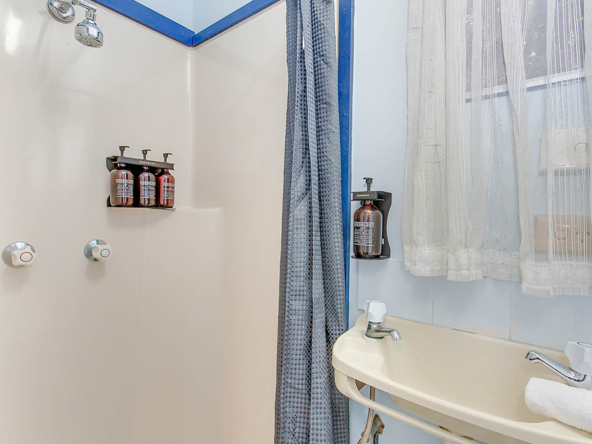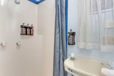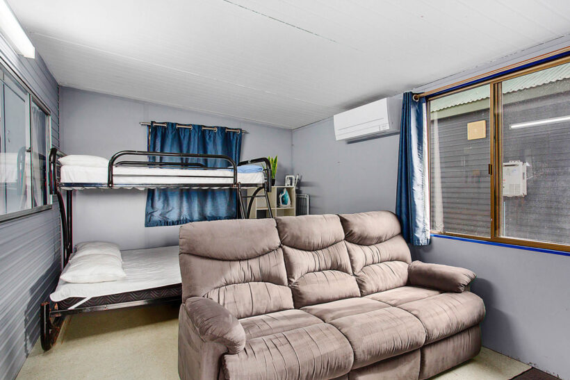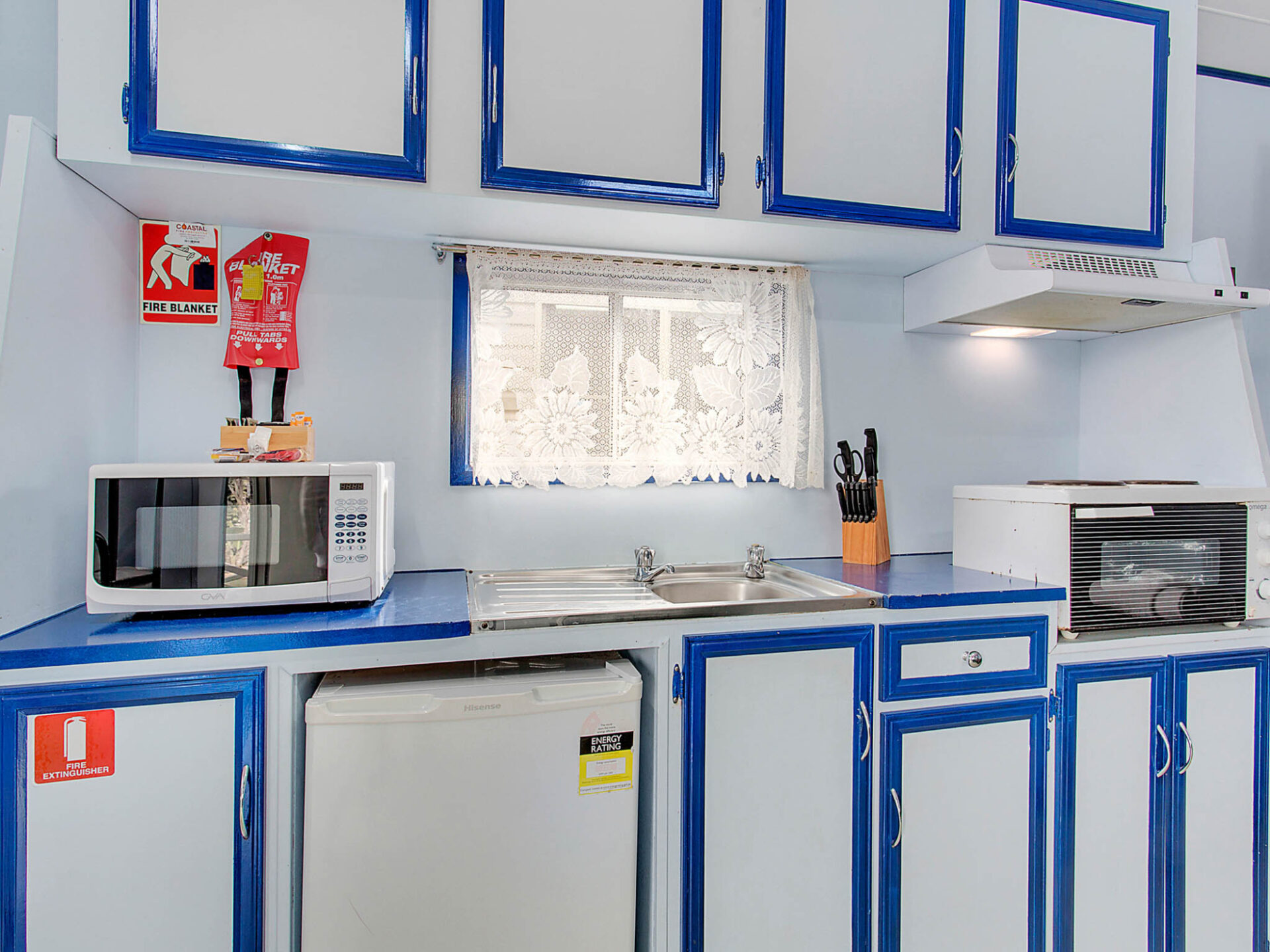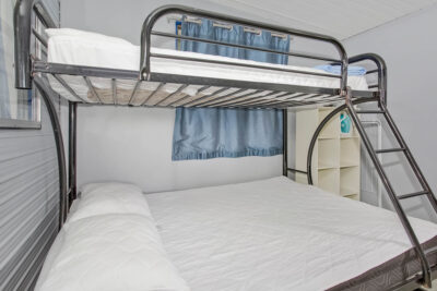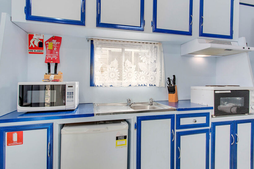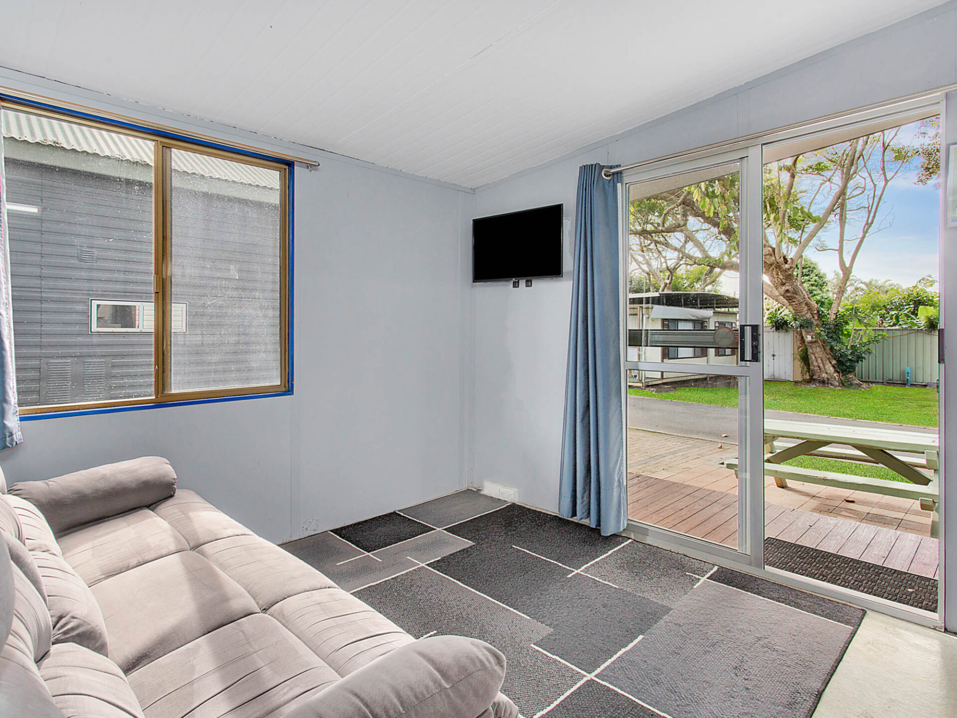 This spacious one-bedroom cabin sleeps up to seven guests and includes a double bed, a set of single bunks, and a tri-bunk. The kitchenette is equipped with a gas oven, microwave, toaster, and bar fridge, making it easy to prepare meals. With air-conditioning, dining area, TV, and a private bathroom with toiletries and towels provided, it’s a practical choice for larger families or groups.